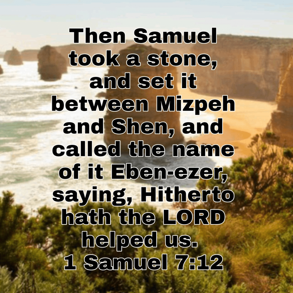 Then Samuel took a stone and set it up between Mizpah and Shen, and called its name Ebenezer, saying, “Thus far the Lord has helped us” I Samuel 7:12 NKJV