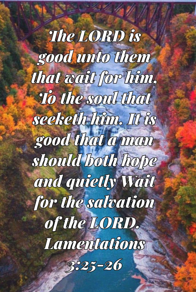 The Lord is good to those who wait for Him, To the soul who seeks Him. It is good that one should hope and wait quietly For the salvation of the Lord. Lamentations 3:25-26 NKJV
