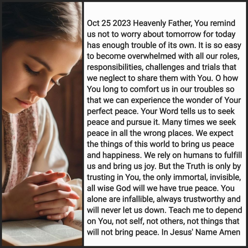 Heavenly Father, You remind us not to worry about tomorrow for today has enough trouble of its own. It is so easy to become overwhelmed with all our roles, responsibilities, challenges, and trials that we neglect to share them with You. O how You long to comfort us in our troubles so that we can experience the wonder of Your perfect peace. Your Word tells us to seek peace and pursue it. Many times, we seek peace in all the wrong places. We expect the things of this world to bring us peace and happiness. We rely on humans to fulfill us and bring us joy. But the Truth is only by trusting in You, the only immortal, invisible, all wise God will we have true peace. You alone are infallible, always trustworthy, and will never let us down. Teach me to depend on You, not self, not others, not things that will not bring peace. In Jesus’ Name Amen