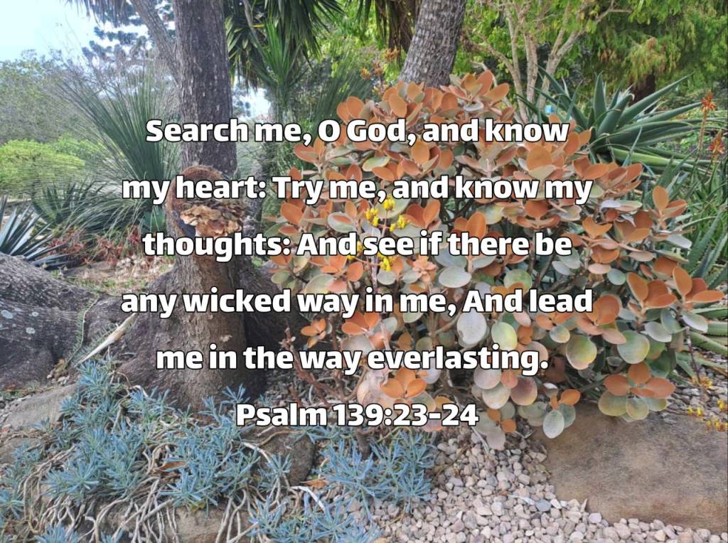 Search me, O God, and know my heart; Try me, and know my anxieties; And see if there is any wicked way in me, And lead me in the way everlasting. Psalms 139:23-24 NKJV