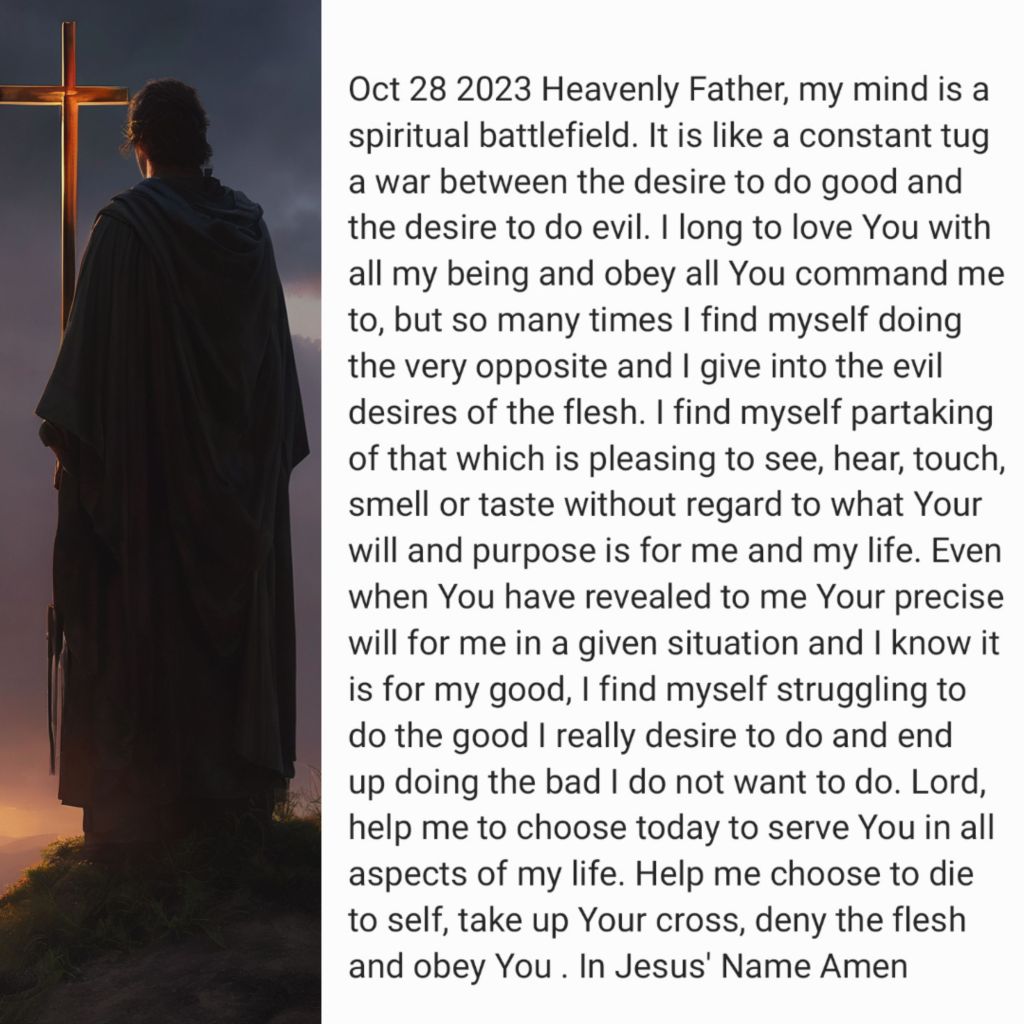 Heavenly Father, my mind is a spiritual battlefield. It is like a constant tug a war between the desire to do good and the desire to do evil. I long to love You with