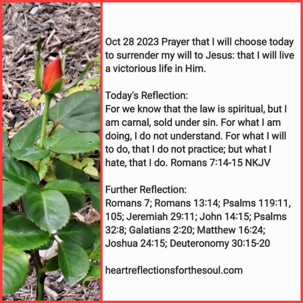 when You have revealed to me Your precise will for me in a given situation, and I know it is for my good, I find myself struggling to do the good I really desire to do and end up doing the bad I do not want to do. Lord, help me to choose today to serve You in all aspects of my life. Help me choose to die to self, take up Your cross, deny the flesh, and obey You . In Jesus’ Name Amen