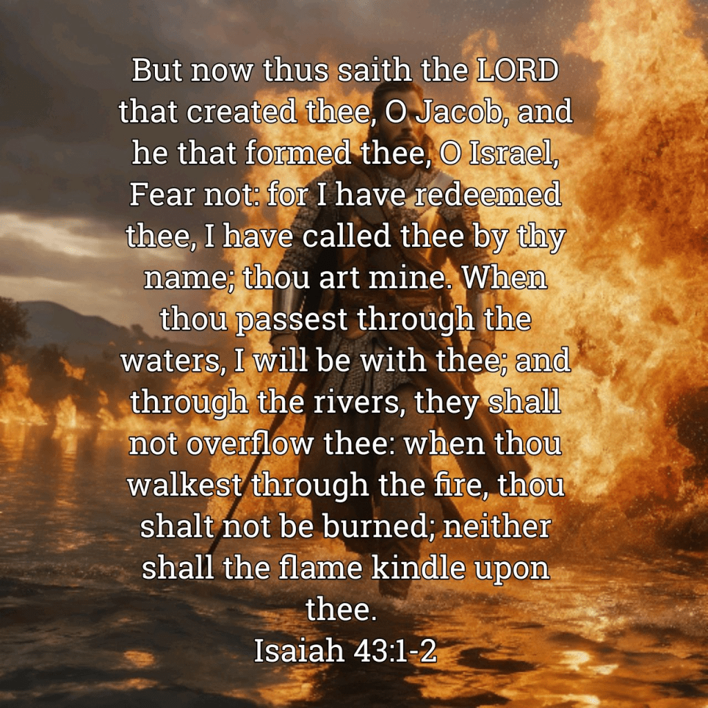 But now, thus says the Lord, who created you, O Jacob, And He who formed you, O Isreal: “Fear not, for I have redeemed you; I have called you by your name; You are Mine. When you pass through the waters, I will be with you; And through the rivers, they shall not overflow you. When you walk through the fire, you shall not be burned, Nor shall the flame scorch you. Isaiah 43:1-2 NKJV