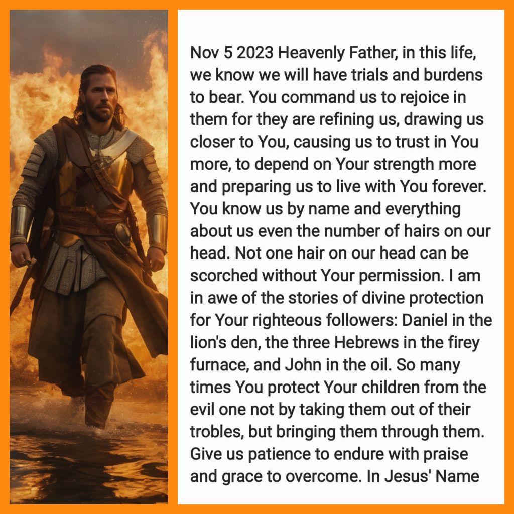 Heavenly Father, in this life, we know we will have trials and burdens to bear. You command us to rejoice in them for they are refining us, drawing us closer to You causing us to trust in You more, to depend on Your strength more and preparing us to live with You forever. You know us by name and everything about us, even the number of hairs on our head. Not one hair on our head can be scorched without Your permission. I am in awe of the stories of divine protection for Your righteous followers: Daniel in the lion’s den, the three Hebrews in the firey furnace, and John in the oil. So many times, You protect Your children from the evil one, not by taking them out of their trobles but by bringing them through them. Give us patience to endure with praise and grace to overcome. In Jesus’ Name Amen