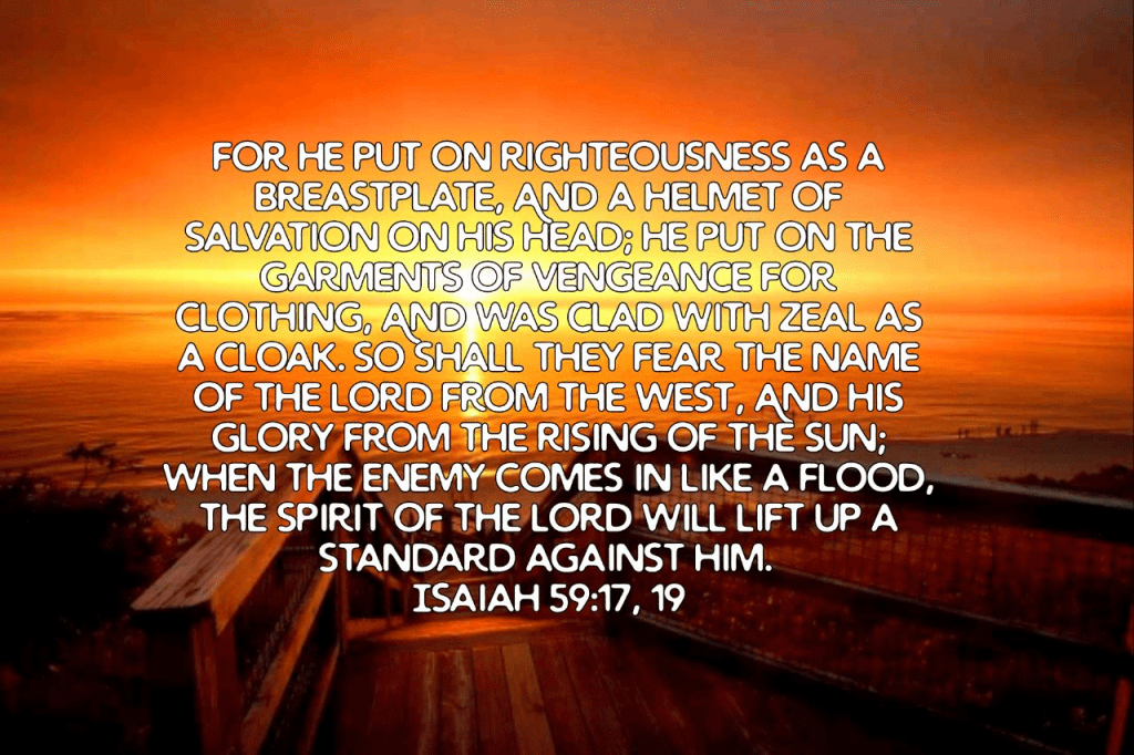 For He put on righteousness as a breastplate, And a helmet of salvation on His head; He put on the garments of vengeance for clothing, And was clad with zeal as a cloak. So shall they fear The name of the Lord from the west, And His glory from the rising of the sun; When the enemy comes in like a flood; the Spirit of the Lord will lift up a standard against him. Isaiah 59:17, 19 NKJV
