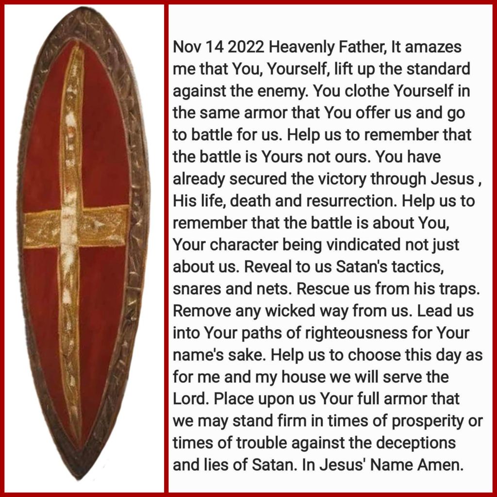 Heavenly Father, It amazes me that You, Yourself, lift up the standard against the enemy. You clothe Yourself in the same armor that You offer us and go to battle for us. Help us to remember that the battle is Yours, not ours. You have already secured the victory through Jesus , His life, death, and resurrection. Help us to remember that the battle is about You, Your character being vindicated not just about us. Reveal to us Satan’s tactics, snares, and nets. Rescue us from his traps. Remove any wicked way from us. Lead us into Your paths of righteousness for Your name’s sake. Help us to choose this day as for me and my house, we will serve the Lord. Place upon us Your full armor that we may stand firm in times of prosperity or times of trouble against the deceptions and lies of Satan. In Jesus’ Name Amen.