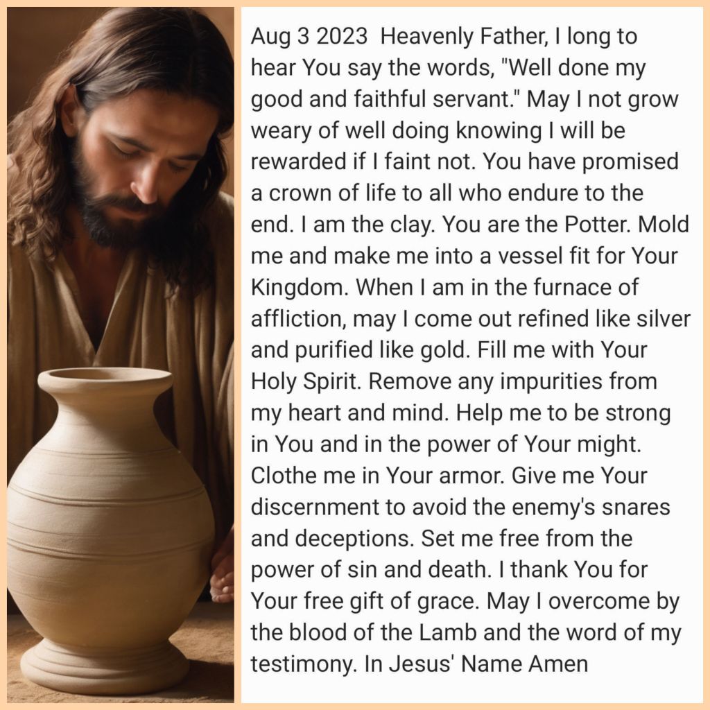 Heavenly Father, I long to hear You say the words, “Well done my good and faithful servant.” May I not grow weary of well doing knowing I will be rewarded if I faint not. You have promised a crown of life to all who endure to the end. I am the clay. You are the Potter. Mold me and make me into a vessel fit for Your Kingdom. When I am in the furnace of affliction, may I come out refined like silver and purified like gold. Fill me with Your Holy Spirit. Remove any impurities from my heart and mind. Help me to be strong in You and in the power of Your might. Clothe me in Your armor. Give me Your discernment to avoid the enemy’s snares and deceptions. Set me free from the power of sin and death. I thank You for Your free gift of grace. May I overcome by the blood of the Lamb and the word of my testimony. In Jesus’ Name Amen