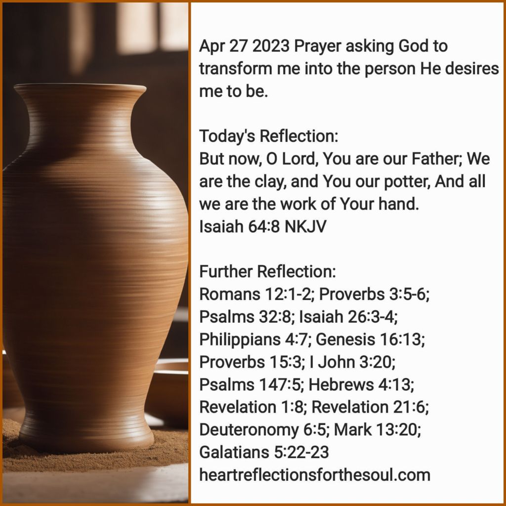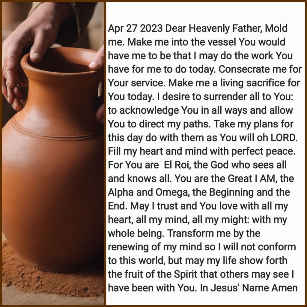 Dear Heavenly Father, Mold me. Make me into the vessel You would have me to be that I may do the work You have for me to do today. Consecrate me for Your service. Make me a living sacrifice for You today. I desire to surrender all to You: to acknowledge You in all ways and allow You to direct my paths. Take my plans for this day to do with them as You will oh LORD. Fill my heart and mind with perfect peace. For You are El Roi, the God who sees all and knows all. You are the Great I AM, the Alpha and Omega, the Beginning and the End. May I trust and You love with all my heart, all my mind, all my might: with my whole being.Transform me by the renewing of my mind so I will not conform to this world, but may my life show forth the fruit of the Spirit that others may see I have been with You. In Jesus’ Name Amen