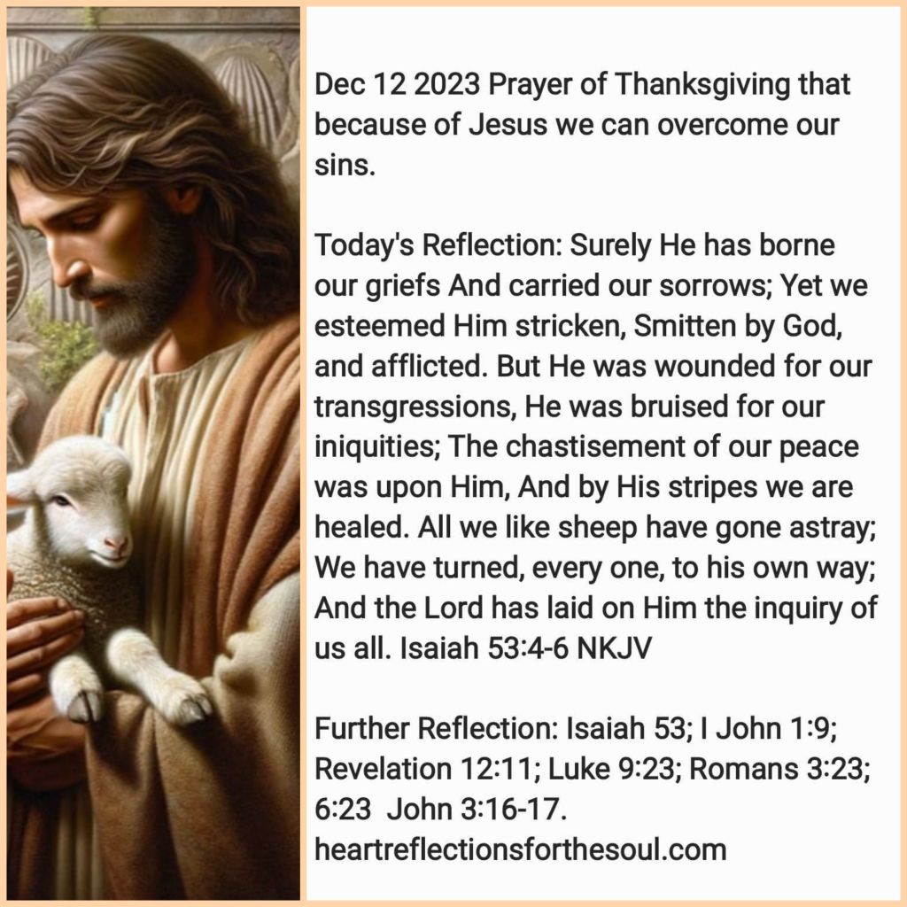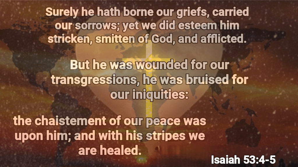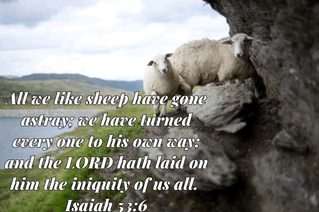 Surely He has borne our griefs And carried our sorrows; Yet we esteemed Him stricken, Smitten by God, and afflicted. But He was wounded for our transgressions, He was bruised for our iniquities; The chastisement of our peace was upon Him, And by His stripes we are healed. All we like sheep have gone astray; We have turned, every one, to his own way; And the Lord has laid on Him the inquiry of us all. Isaiah 53:4-6 NKJV