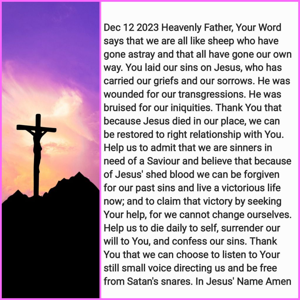 Heavenly Father, Your Word says that we are all like sheep who have gone astray and that all have gone our own way. You laid our sins on Jesus, who has carried our griefs and our sorrows. He was wounded for our transgressions. He was bruised for our iniquities. Thank You that because Jesus died in our place, we can be restored to right relationship with You. Help us to admit that we are sinners in need of a Saviour and believe that because of Jesus’ shed blood we can be forgiven for our past sins and live a victorious life now; and to claim that victory by seeking Your help, for we cannot change ourselves.