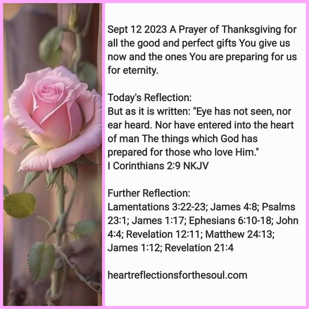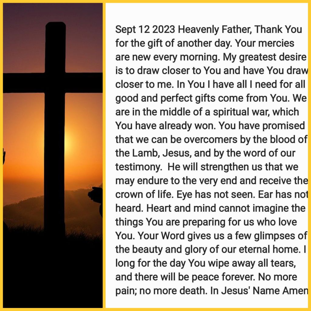 Heavenly Father, Thank You for the gift of another day. Your mercies are new every morning. My greatest desire is to draw closer to You and have You draw closer to me. In You I have all I need for all good and perfect gifts come from You. We are in the middle of a spiritual war, which You have already won. You have promised that we can be overcomers by the blood of the Lamb, Jesus, and by the word of our testimony. He will strengthen us that we may endure to the very end and receive the crown of life. Eye has not seen. Ear has not heard. Heart and mind cannot imagine the things You are preparing for us who love You. Your Word gives us a few glimpses of the beauty and glory of our eternal home. I long for the day You wipe away all tears, and there will be peace forever. No more pain; no more death. In Jesus’ Name Amen