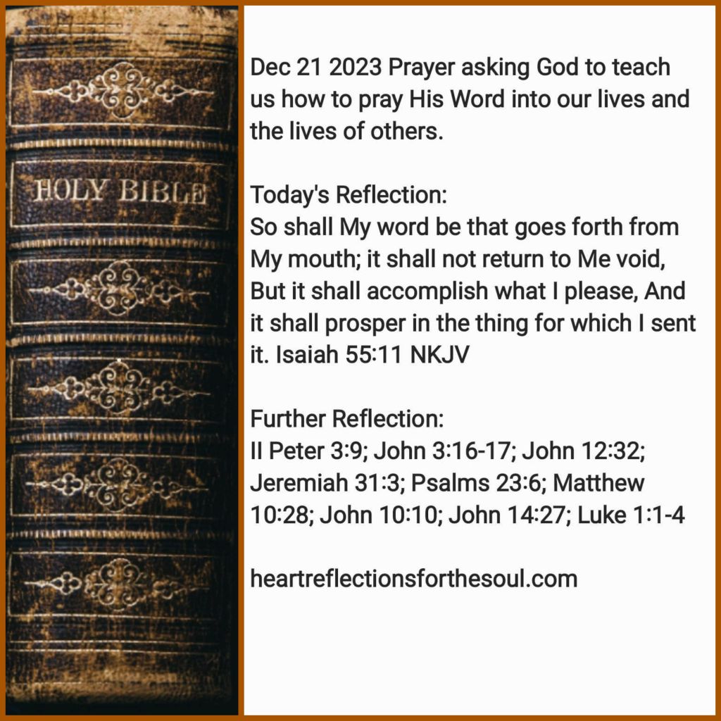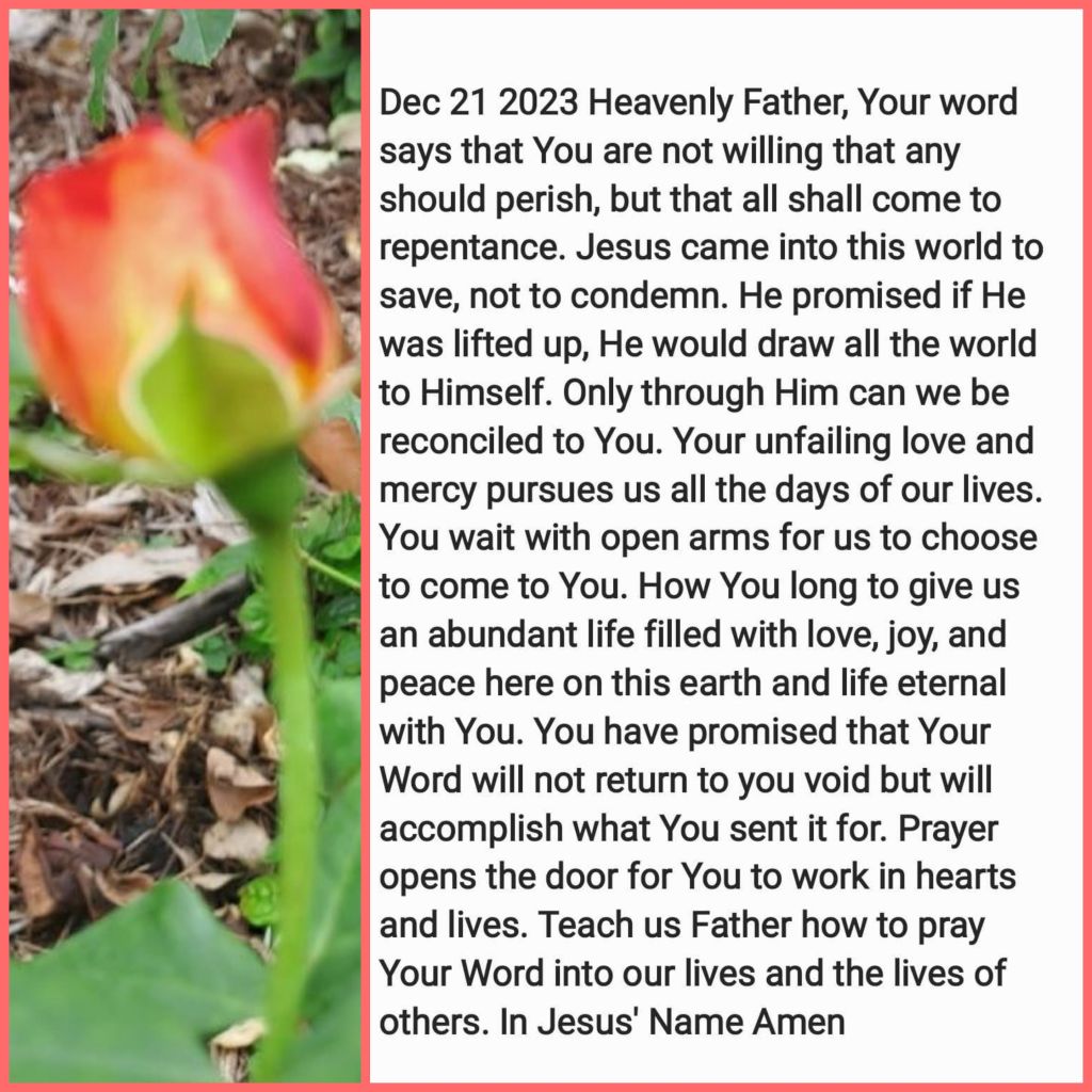 Heavenly Father, Your word says that You are not willing that any should perish, but that all shall come to repentance. Jesus came into this world to save, not to condemn. He promised if He was lifted up, He would draw all the world to Himself. Only through Him can we be reconciled to You. Your unfailing love and mercy pursues us all the days of our lives. You wait with open arms for us to choose to come to You. How You long to give us an abundant life filled with love, joy, and peace here on this earth and life eternal with You. You have promised that Your Word will not return to you void but will accomplish what You sent it for. Prayer opens the door for You to work in hearts and lives. Teach us Father how to pray Your Word into our lives and the lives of others. In Jesus’ Name Amen