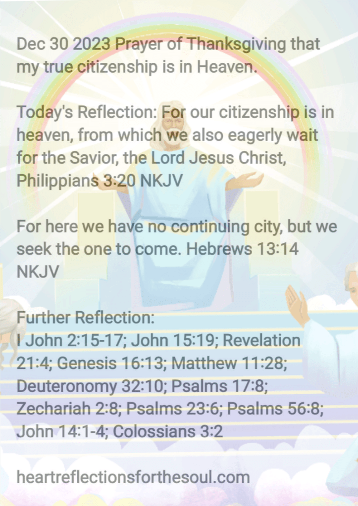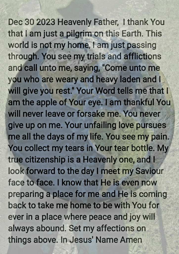 Heavenly Father, I thank You that I am just a pilgrim on this Earth. This world is not my home, I am just passing through. You see my trials and afflictions and call unto me, saying, “Come unto me you who are weary and heavy laden and I will give you rest.” Your Word tells me that I am the apple of Your eye. I am thankful You will never leave or forsake me. You never give up on me. Your unfailing love pursues me all the days of my life. You see my pain. You collect my tears in Your tear bottle. My true citizenship is a Heavenly one, and I look forward to the day I meet my Saviour face to face. I know that He is even now preparing a place for me and He is coming back to take me home to be with You for ever in a place where peace and joy will always abound. Set my affections on things above. In Jesus’ Name Amen