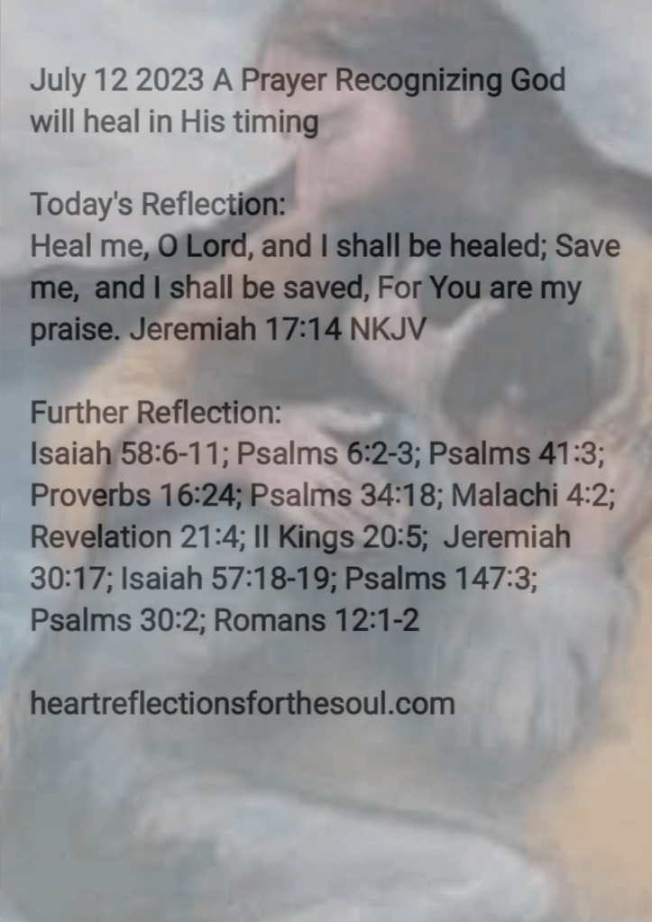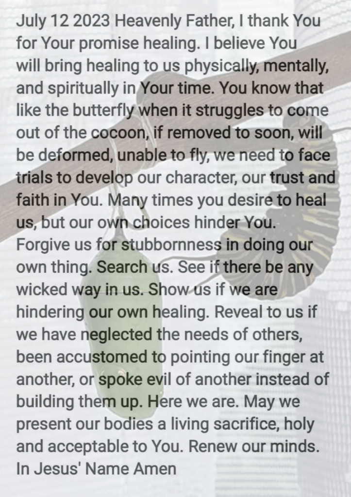 Heavenly Father, I thank You for Your promise healing. I believe You will bring healing to us physically, mentally, and spiritually in Your time. You know that like the butterfly when it struggles to come out of the cocoon, if removed to soon, will be deformed, unable to fly, we need to face trials to develop our character, our trust and faith in You. Many times, you desire to heal us, but our own choices hinder You. Forgive us for stubbornness in doing our own thing. Search us. See if there be any wicked way in us. Show us if we are hindering our own healing. Reveal to us if we have neglected the needs of others, been accustomed to pointing our finger at another, or spoke evil of another instead of building them up. Here we are. May we present our bodies a living sacrifice, holy and acceptable to You. Renew our minds. In Jesus’ Name Amen.