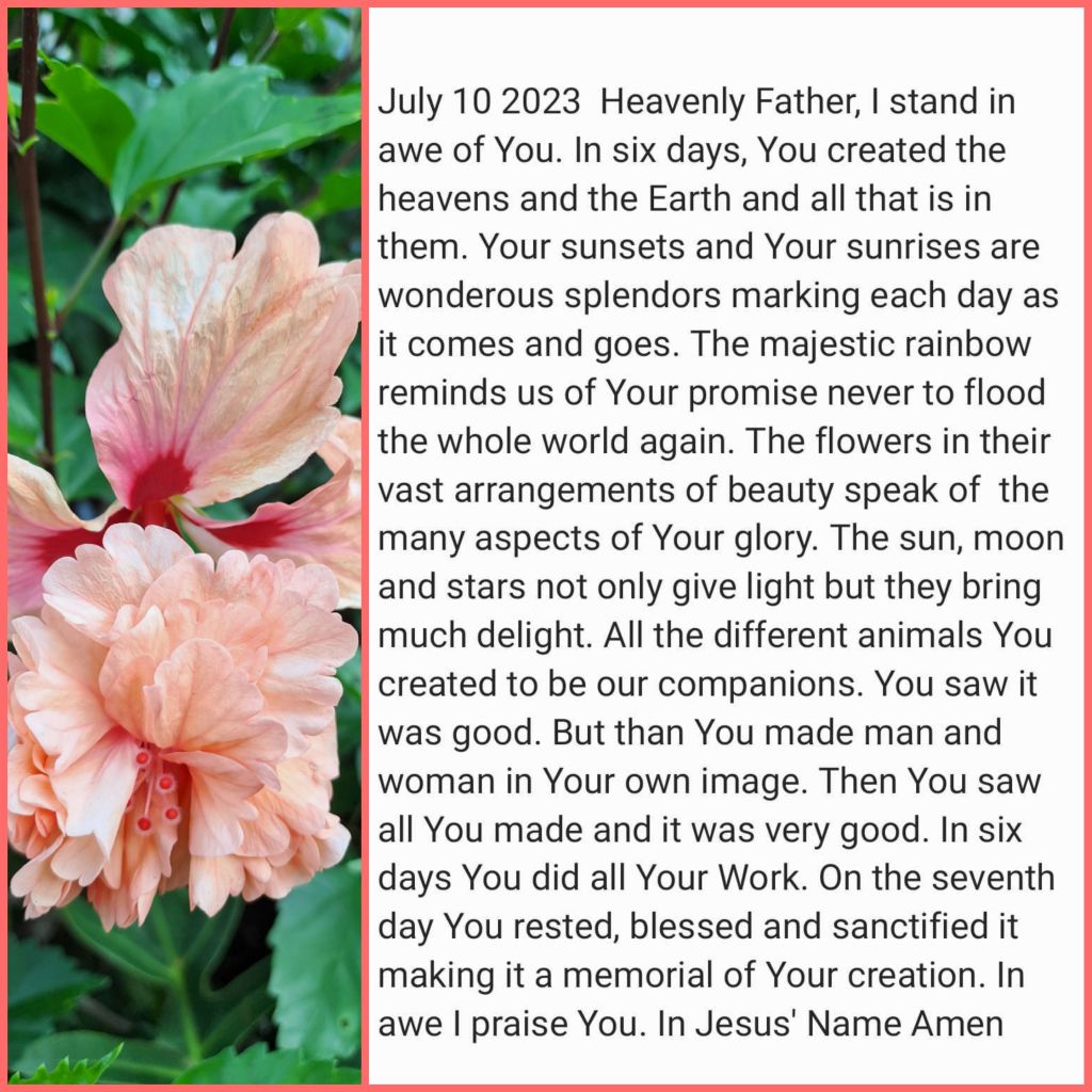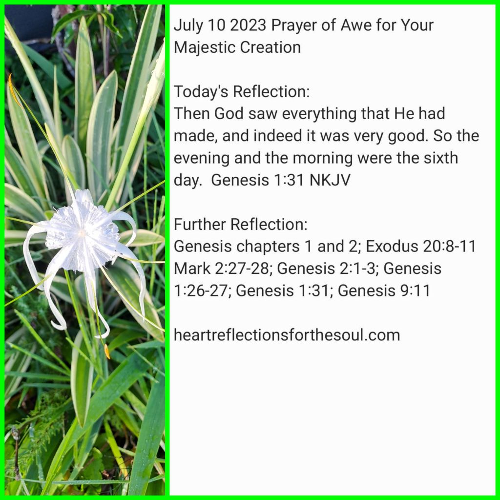 Heavenly Father, I stand in awe of You. In six days, You created the heavens and the Earth and all that is in them. Your sunsets and Your sunrises are wonderous splendors marking each day as it comes and goes. The majestic rainbow reminds us of Your promise never to flood the whole world again. The flowers in their vast arrangements of beauty speak of the many aspects of Your glory. The sun, moon, and stars not only give light but they bring much delight. All the different animals You created to be our companions. You saw it was good. But then You made man and woman in Your own image. Then You saw all You made and it was very good. In six days, You did all Your Work. On the seventh day, You rested, blessed and sanctified it making it a memorial of Your creation. In awe I praise You. In Jesus’ Name Amen