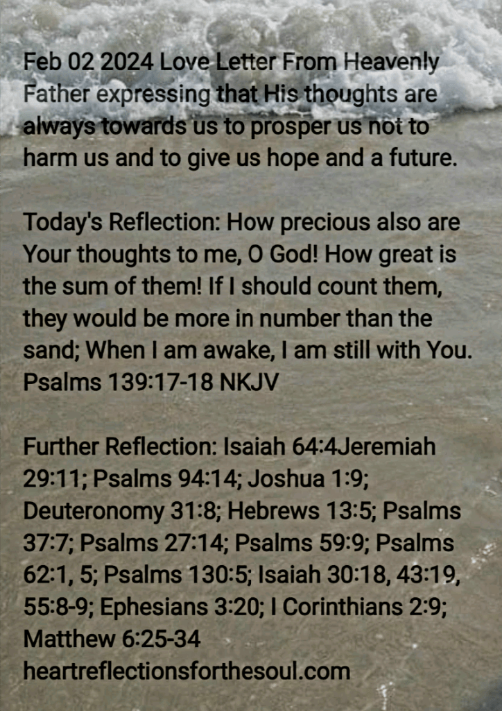 Today’s Reflection: How precious also are Your thoughts to me, O God! How great is the sum of them! If I should count them, they would be more in number than the sand; When I am awake, I am still with You. Psalms 139:17-18 NKJV