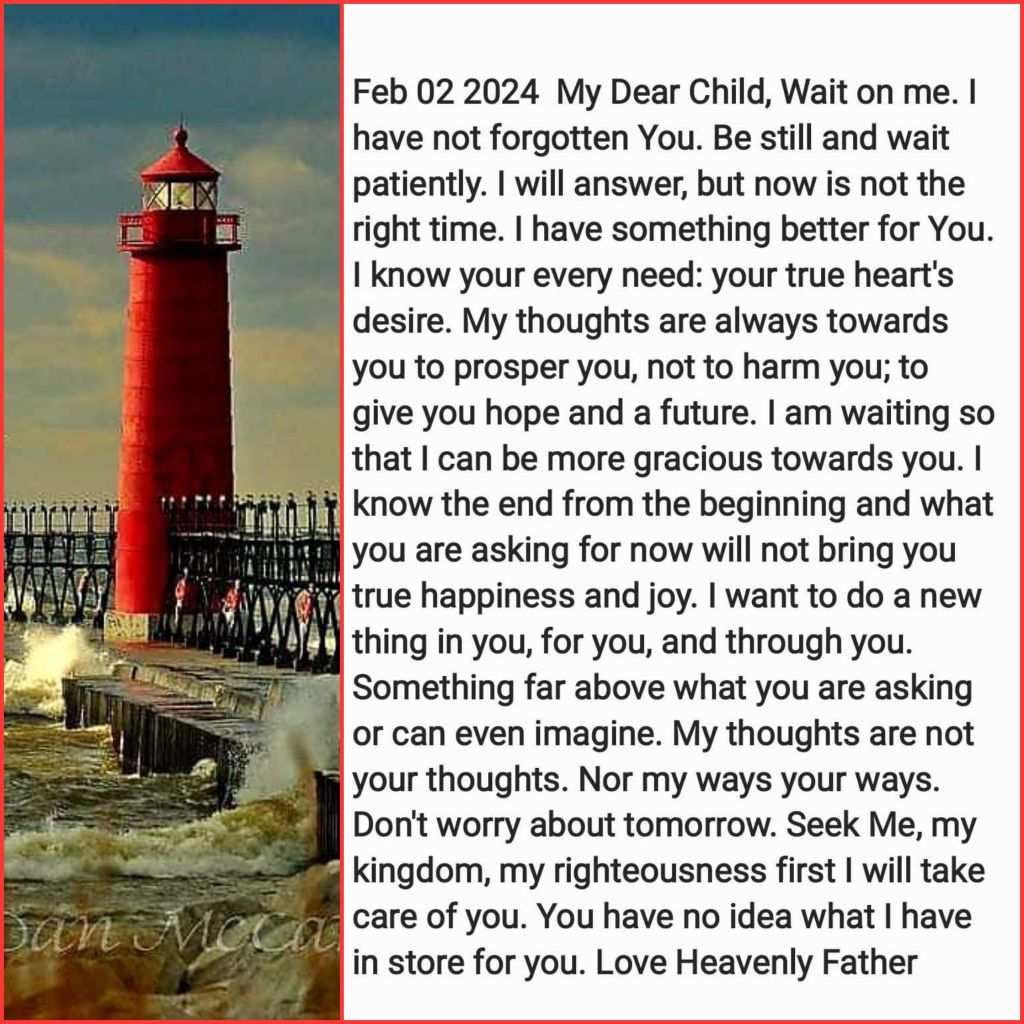 Wait on me. I have not forgotten You. Be still and wait patiently. I will answer, but now is not the right time. I have something better for You. I know your every need: your true heart’s desire. My thoughts are always towards you to prosper you, not to harm you; to give you hope and a future. I am waiting so that I can be more gracious towards you. I know the end from the beginning and what you are asking for now will not bring you true happiness and joy. I want to do a new thing in you, for you, and through you. Something far above what you are asking or can even imagine. My thoughts are not your thoughts. Nor my ways your ways. Don’t worry about tomorrow. Seek Me, my kingdom, my righteousness first. I will take care of you. You have no idea what I have in store for you.