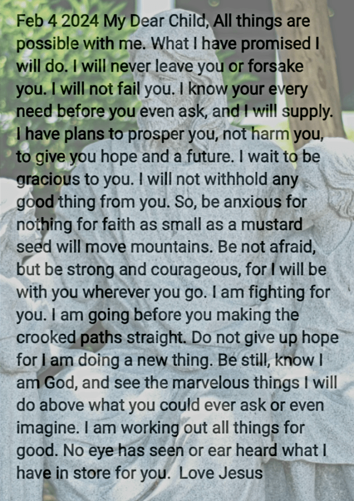 All things are possible with me. What I have promised I will do. I will never leave you or forsake you. I will not fail you. I know your every need before you even ask, and I will supply. I have plans to prosper you, not harm you, to give you hope and a future. I wait to be gracious to you. I will not withhold any good thing from you. So, be anxious for nothing for faith as small as a mustard seed will move mountains. Be not afraid, but be strong and courageous, for I will be with you wherever you go. I am fighting for you. I am going before you making the crooked paths straight. Do not give up hope, for I am doing a new thing. Be still, know I am God, and see the marvelous things I will