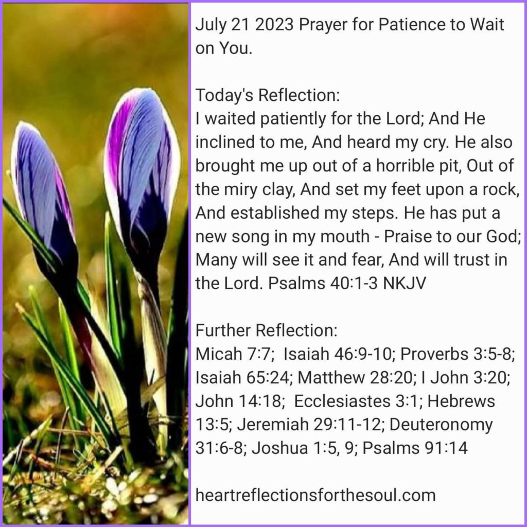 I waited patiently for the Lord; And He inclined to me, And heard my cry. He also brought me up out of a horrible pit, Out of the miry clay, And set my feet upon a rock, And established my steps. He has put a new song in my mouth ‐ Praise to our God; Many will see it and fear, And will trust in the Lord. Psalms 40:1-3 NKJV