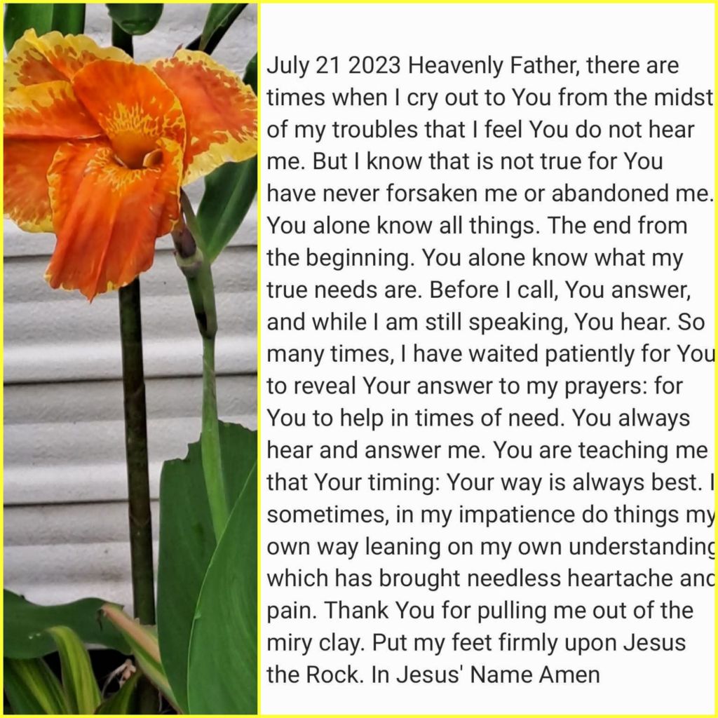 Heavenly Father, there are times when I cry out to You from the midst of my troubles that I feel You do not hear me. But I know that is not true for You have never forsaken me or abandoned me. You alone know all things. The end from the beginning. You alone know what my true needs are. Before I call, You answer, and while I am still speaking, You hear. So many times, I have waited patiently for You to reveal Your answer to my prayers: for You to help in times of need. You always hear and answer me. You are teaching me that Your timing: Your way is always best. I sometimes, in my impatience, do things my own way, leaning on my own understanding