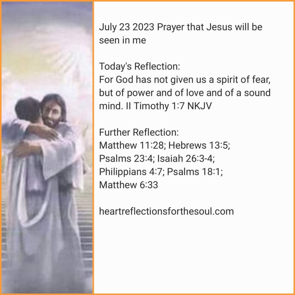 Heavenly Father, You have not given us the spirit of fear. Fear is of the devil, not You. You have given us the spirit of power, love, and of a sound mind. You invite us to come to You when we are weary and heavy laden. You promise to give us rest. You will never fail us, abandon, or forsake us. In the valley of the shadow of death, You will walk with us. We need not fear the evil one for You are with us. Your rod and Your staff they comfort us. You give power to the faint and to them who have no might You increase strength. I love You, oh LORD, my strength. Help me to wait on You that I may have Your perfect peace fill my heart and mind. May Jesus be seen in me. May Your peace and joy shine forth from me. Use me to spread Your love, Your peace, and Your joy to others. May I always seek You first. In Jesus’ Name Amen