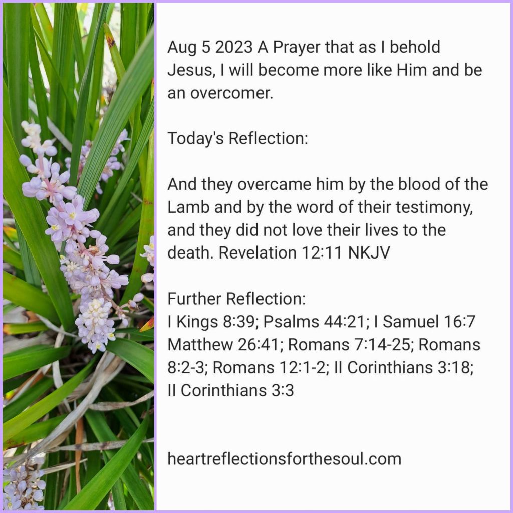 knew no sin became the sacrificial Lamb that through His blood and the word of our testimony, Satan’s bonds can be broken and we can overcome. Give me a thirst to know my Jesus more. Renew my mind that I will no longer have any desire to conform to the patterns of this world. As I behold Jesus and His life as You revealed in Your Word, transform me more and more to be like Him. Write Your laws in my heart so that when I obey You, it is as though obey my own impulses. In Jesus’ Name Amen