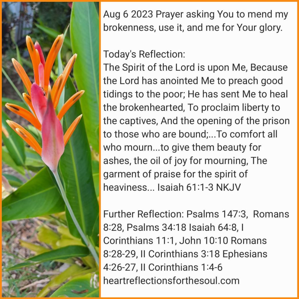 Further Reflection: Psalms 147:3, Romans 8:28, Psalms 34:18 Isaiah 64:8, I Corinthians 11:1, John 10:10 Romans 8:28-29, II Corinthians 3:18 Ephesians 4:26-27, II Corinthians 1:4-6
