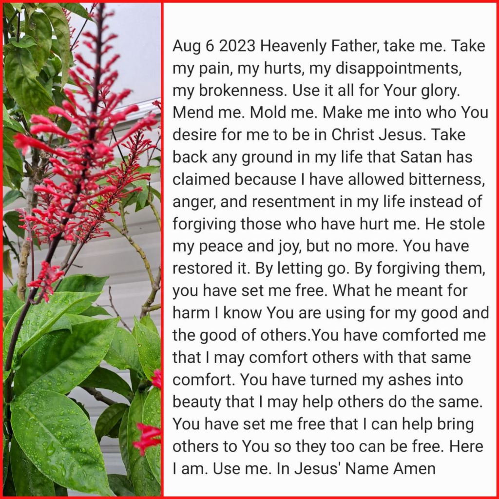 desire for me to be in Christ Jesus. Take back any ground in my life that Satan has claimed because I have allowed bitterness, anger, and resentment in my life instead of forgiving those who have hurt me. He stole my peace and joy, but no more. You have restored it. By letting go. By forgiving them, you have set me free. What he meant for harm I know You are using for my good and the good of others.You have comforted me that I may comfort others with that same comfort. You have turned my ashes into beauty that I may help others do the same. You have set me free that I can help bring others to You so they too can be free. Here I am. Use me. In Jesus’ Name Amen