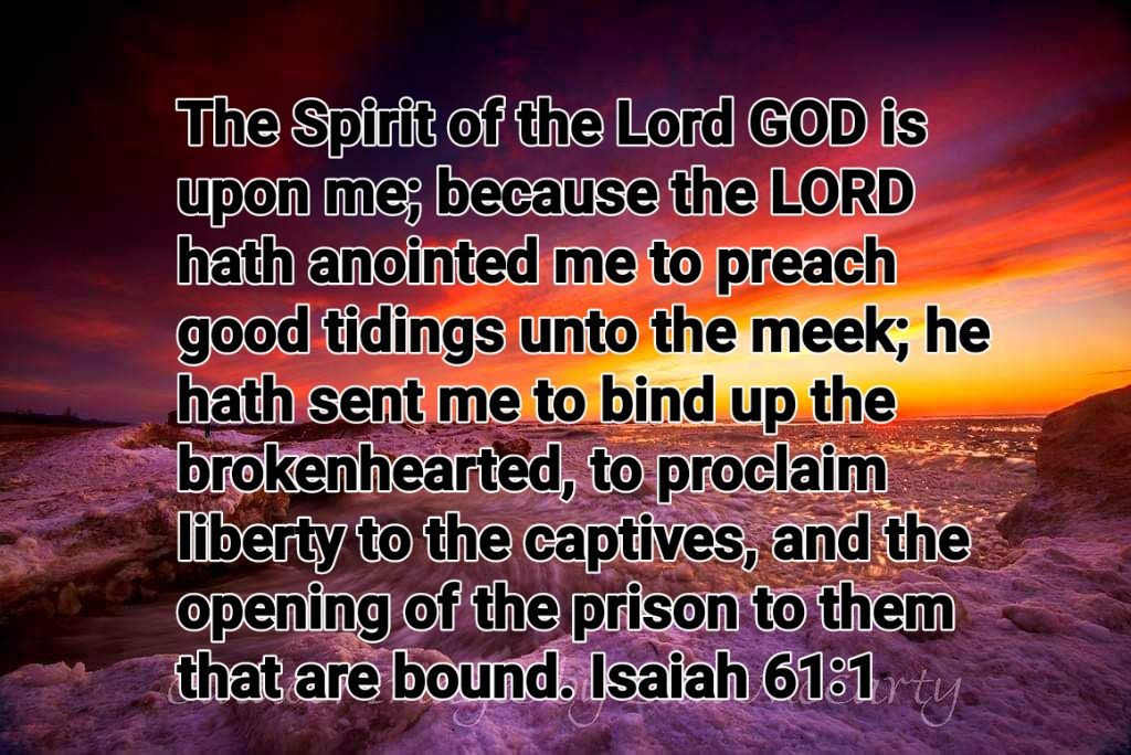 The Spirit of the Lord is upon Me, Because the Lord has anointed Me to preach good tidings to the poor; He has sent Me to heal the brokenhearted, To proclaim liberty to the captives, And the opening of the prison to those who are bound;…To comfort all who mourn…to give them beauty for ashes, the oil of joy for mourning, The garment of praise for the spirit of heaviness… Isaiah 61:1-3 NKJV
