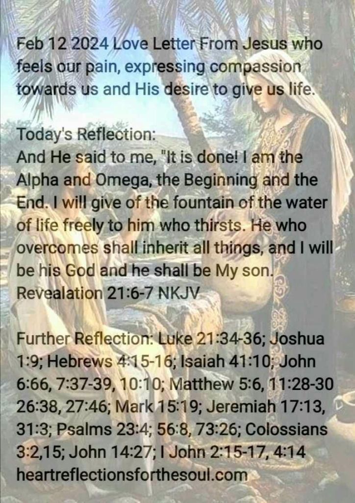 And He said to me, “It is done! I am the Alpha and Omega, the Beginning and the End. I will give of the fountain of the water of life freely to him who thirsts. He who overcomes shall inherit all things, and I will be his God and he shall be My son. Revealation 21:6-7 NKJV