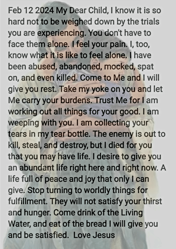 I know it is so hard not to be weighed down by the trials you are experiencing. You don’t have to face them alone. I feel your pain. I, too, know what it is like to feel alone. I have been abused, abandoned, mocked, spat on, and even killed. Come to Me and I will give you rest. Take my yoke on you and let Me carry your burdens. Trust Me for I am working out all things for your good. I am weeping with you. I am collecting your tears in my tear bottle. The enemy is out to kill, steal, and destroy, but I died for you that you may have life. I desire to give you an abundant life right here and right now. A life full of peace and joy that only I can give. Stop turning to worldly things for fulfillment. They will not satisfy your thirst and hunger. Come drink of the Living Water, and eat of the bread I will give you and be satisfied.