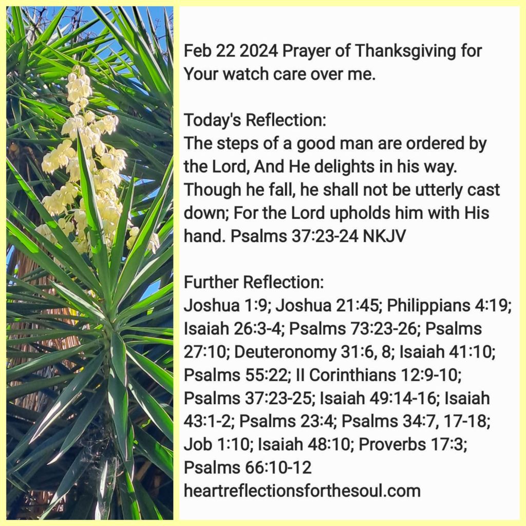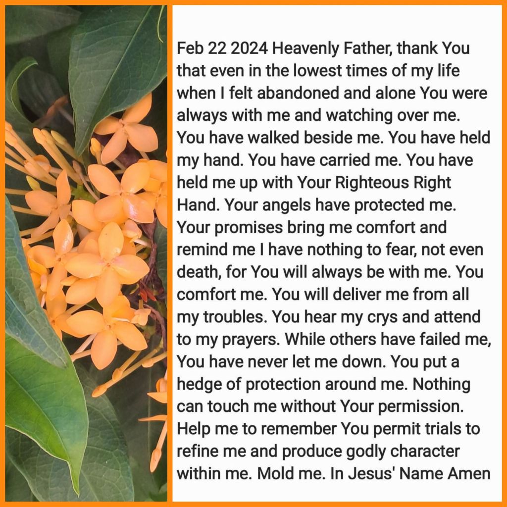 Heavenly Father, thank You that even in the lowest times of my life when I felt abandoned and alone You were always with me and watching over me. You have walked beside me. You have held my hand. You have carried me. You have held me up with Your Righteous Right Hand. Your angels have protected me. Your promises bring me comfort and remind me I have nothing to fear, not even death, for You will always be with me. You comfort me. You will deliver me from all my troubles. You hear my crys and attend to my prayers. While others have failed me, You have never let me down. You put a hedge of protection around me. Nothing can touch me without Your permission. Help me to remember You permit trials to refine me and produce godly character within me. Mold me. In Jesus’ Name Amen