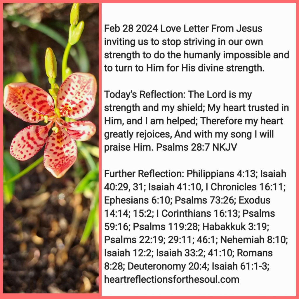 Further Reflection: Philippians 4:13; Isaiah 40:29, 31; Isaiah 41:10, I Chronicles 16:11; Ephesians 6:10; Psalms 73:26; Exodus 14:14; 15:2; I Corinthians 16:13; Psalms 59:16; Psalms 119:28; Habakkuk 3:19; Psalms 22:19; 29:11; 46:1; Nehemiah 8:10; Isaiah 12:2; Isaiah 33:2; 41:10; Romans 8:28; Isaiah 61:1-3; Deuteronomy 20:4