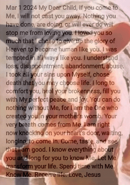 I took all your sins upon Myself, chose death that you may choose life. I long to comfort you, heal your brokenness, fill you with My perfect peace and joy. You can do nothing without Me, for I am the One who created you in your mother’s womb. Your very breath comes from Me. I am right now knocking on your heart’s door, waiting, longing, to come in. Come, taste, and see that I am good. I know everything about you and long for you to know Me. Let Me transform your life. Spend time with Me. Know Me. Receive life. Love, Jesus