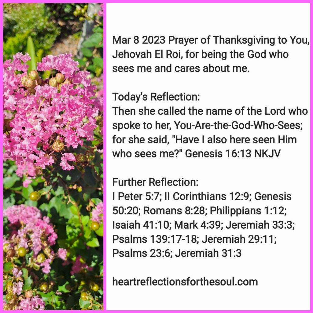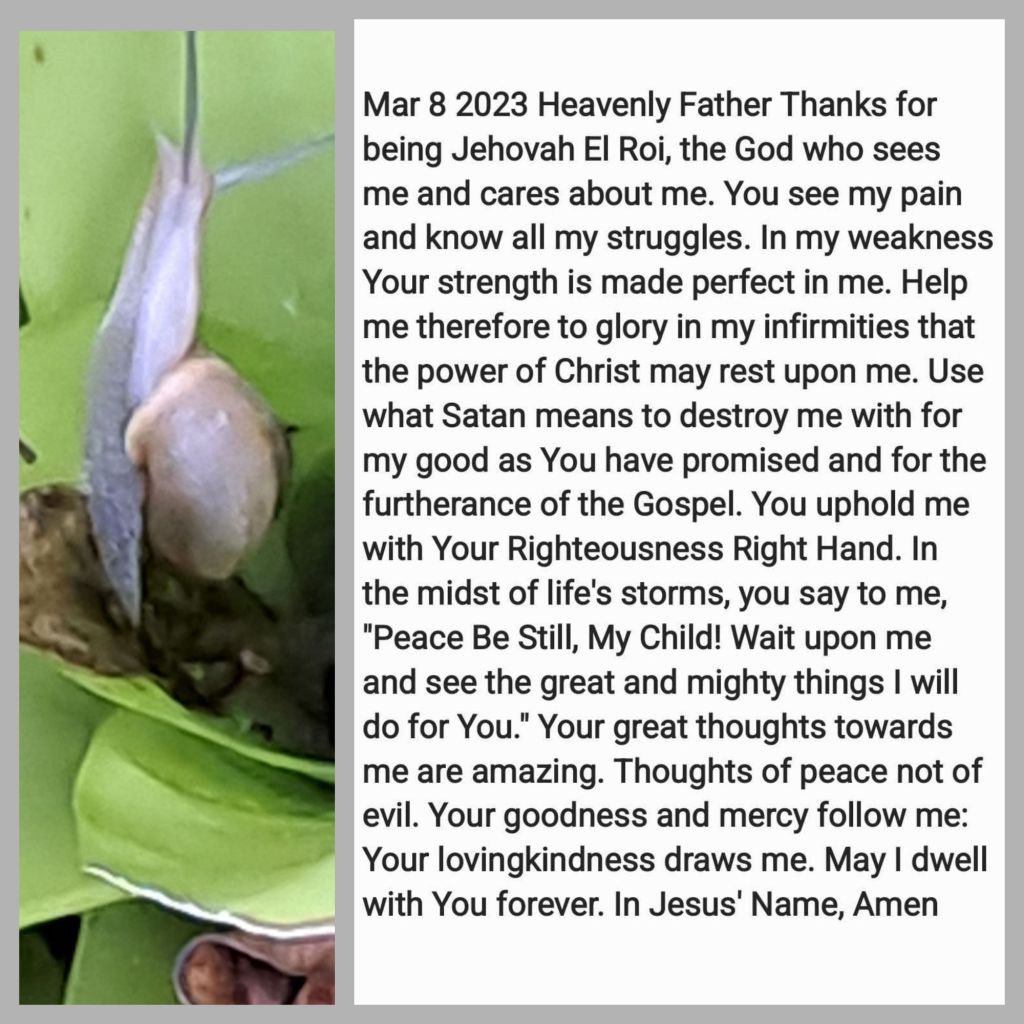 Heavenly Father, thanks for being Jehovah El Roi, the God who sees me and cares about me. You see my pain and know all my struggles. In my weakness, Your strength is made perfect in me. Help me therefore to glory in my infirmities that the power of Christ may rest upon me. Use what Satan means to destroy me with for my good as You have promised and for the furtherance of the Gospel. You uphold me with Your Righteousness Right Hand. In the midst of life’s storms, you say to me, “Peace Be Still, My Child! Wait upon me and see the great and mighty things I will do for You.” Your great thoughts towards me are amazing. Thoughts of peace not of evil. Your goodness and mercy follow me: Your lovingkindness draws me. May I dwell with You forever. In Jesus’ Name, Amen