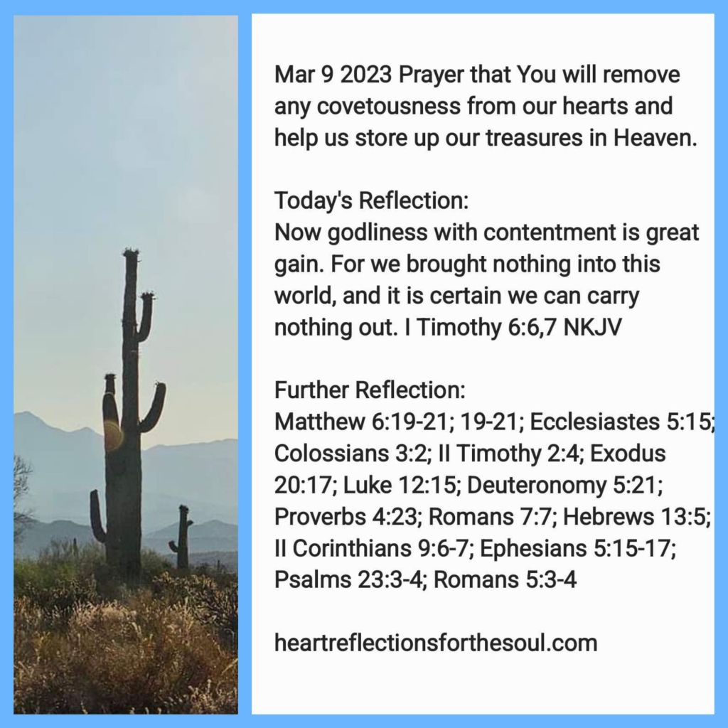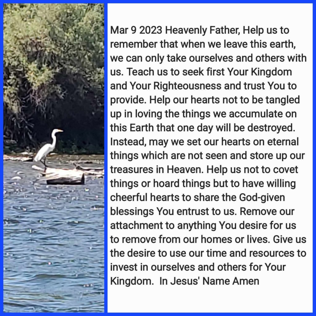 Heavenly Father, Help us to remember that when we leave this earth, we can only take ourselves and others with us. Teach us to seek first Your Kingdom and Your Righteousness and trust You to provide. Help our hearts not to be tangled up in loving the things we accumulate on this Earth that one day will be destroyed. Instead, may we set our hearts on eternal things which are not seen and store up our treasures in Heaven. Help us not to covet things or hoard things but to have willing cheerful hearts to share the God-given blessings You entrust to us. Remove our attachment to anything You desire for us to remove from our homes or lives. Give us the desire to use our time and resources to invest in ourselves and others for Your Kingdom. In Jesus’ Name Amen