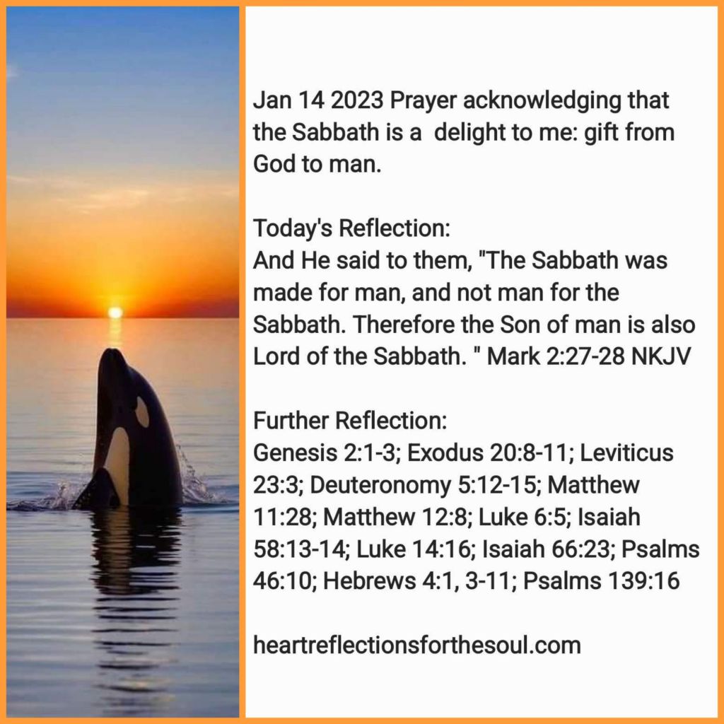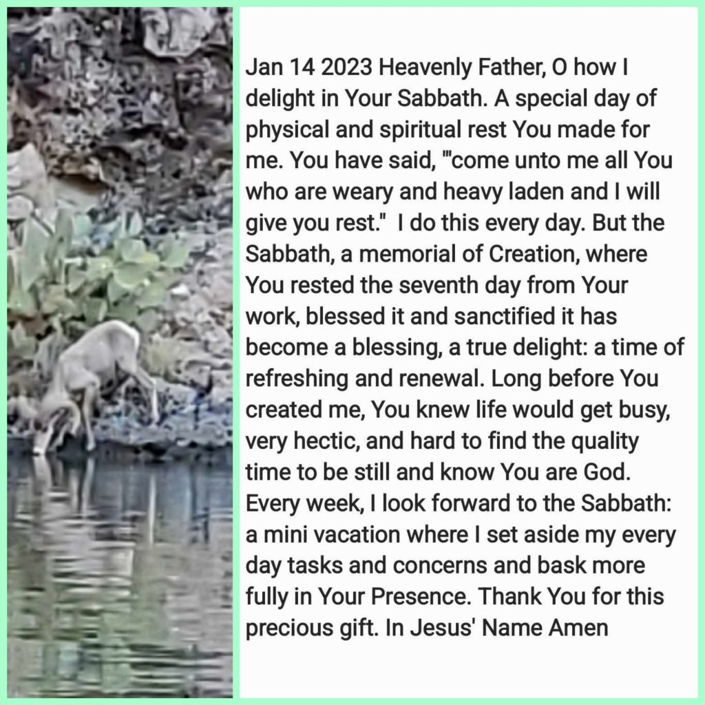 Heavenly Father, O how I delight in Your Sabbath. A special day of physical and spiritual rest You made for me. You have said, “‘come unto me all You who are weary and heavy laden and I will give you rest.” I do this every day. But the Sabbath, a memorial of Creation, where You rested the seventh day from Your work, blessed it and sanctified it has become a blessing, a true delight: a time of refreshing and renewal. Long before You created me, You knew life would get busy, very hectic, and hard to find the quality time to be still and know You are God. Every week, I look forward to the Sabbath: a mini vacation where I set aside my every day tasks and concerns and bask more fully in Your Presence. Thank You for this precious gift. In Jesus’ Name Amen