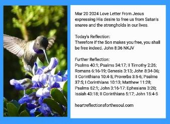 I hear your cries. I see your struggles. You are trapped in Satan’s snares. A slave to his lies. You long to be free of the strongholds in your life, but you don’t know how. You have tried to break free in your own strength. You have leaned on your own understanding. You are weary and heavy laden. Come to Me. Be still. Wait on Me. For without Me, you can do nothing, but with Me, all things are possible. I long to set you free and when I do you will be free indeed. I will do a new thing in you. I will do in you and through you great and mighty things exceedingly abundantly above all you could ever ask or even imagine. I have come to save you, not condemn you. I have given my own life in this battle against sin. Will you accept the gift of forgiveness and eternal life? Then I can set you free. Transform you into a new creature. If you abide in Me and I in you, you will bring forth much fruit.