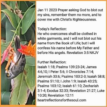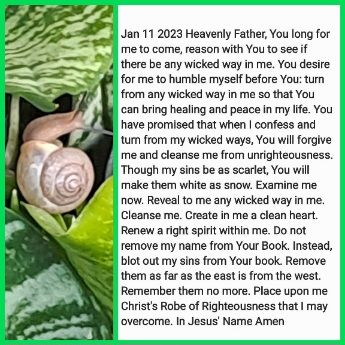 Heavenly Father, You long for me to come, reason with You to see if there be any wicked way in me. You desire for me to humble myself before You: turn from any wicked way in me so that You can bring healing and peace in my life. You have promised that when I confess and turn from my wicked ways, You will forgive me and cleanse me from unrighteousness. Though my sins be as scarlet, You will make them white as snow. Examine me now. Reveal to me any wicked way in me. Cleanse me. Create in me a clean heart. Renew a right spirit within me. Do not remove my name from Your Book. Instead, blot out my sins from Your book. Remove them as far as the east is from the west. Remember them no more. Place upon me Christ’s Robe of Righteousness that I may overcome. In Jesus’ Name Amen