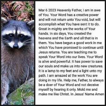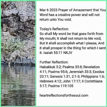 Heavenly Father, I am in awe of You. Your Word has a creative power and will not return unto You void, but will accomplish what You have sent it to do. Great in mighty are the works of Your hands. In six days, You created the heavens and the Earth and all that is in them. You have begun a good work in me which You have promised to continue until Jesus returns. You are teaching me to speak Your Word into our lives. Your Word is alive and powerful. It has power to save our souls and make us into new creatures.