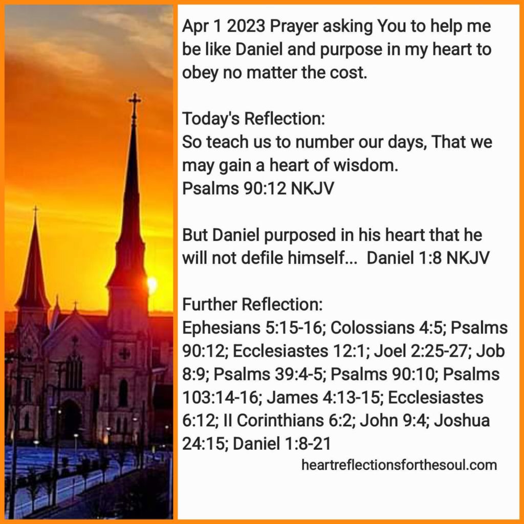Now is the time to work while it is yet day. Reveal how our daily choices are drawing us close to You or leading us away from You. Today, l want to be like Joshua and make a stand to serve You and like Daniel to purpose in my heart to obey You. In Jesus’ Name Amen