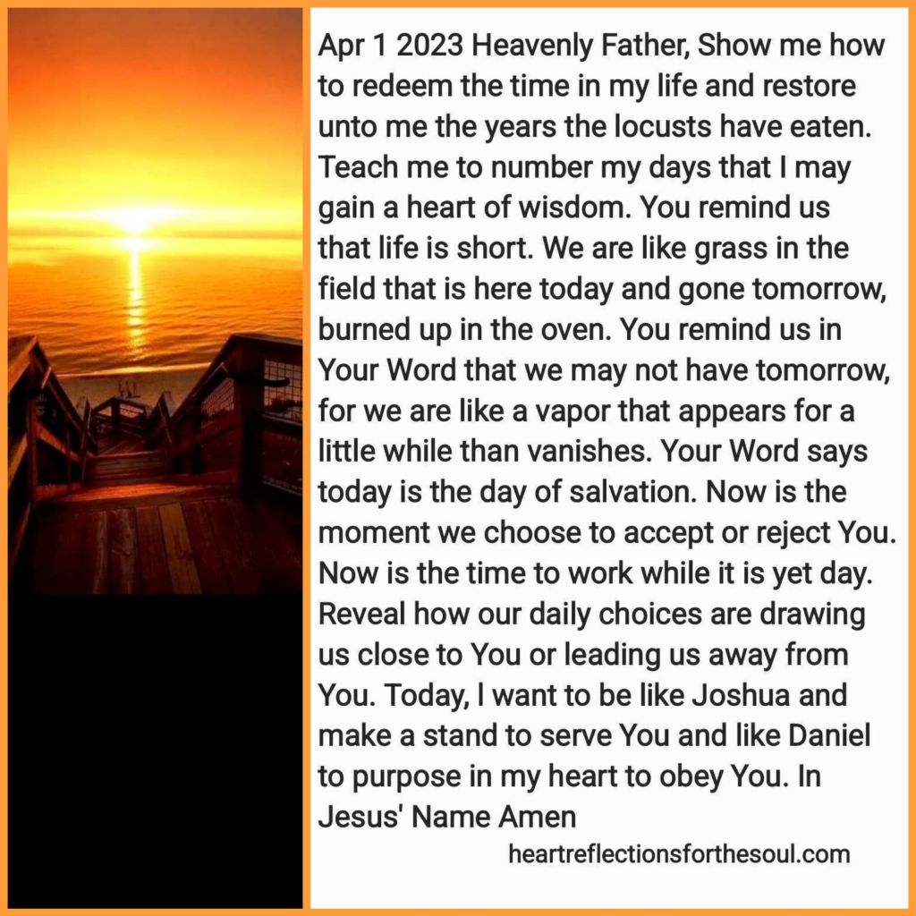 Heavenly Father, Show me how to redeem the time in my life and restore unto me the years the locusts have eaten. Teach me to number my days that I may gain a heart of wisdom. You remind us that life is short. We are like grass in the field that is here today and gone tomorrow, burned up in the oven. You remind us in Your Word that we may not have tomorrow, for we are like a vapor that appears for a little while than vanishes. Your Word says today is the day of salvation. Now is the moment we choose to accept or reject You.