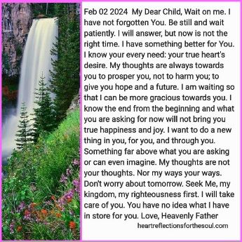 My Dear Child, Wait on me. I have not forgotten You. Be still and wait patiently. I will answer, but now is not the right time. I have something better for You. I know your every need: your true heart’s desire. My thoughts are always towards you to prosper you, not to harm you; to give you hope and a future. I am waiting so that I can be more gracious towards you. I know the end from the beginning, and what you are asking for now will not bring you true happiness and joy. I want to do a new thing in you, for you, and through you. Something far above what you are asking or can even imagine. My thoughts are not your thoughts. Nor my ways your ways. Don’t worry about tomorrow. Seek Me, my kingdom, my righteousness first. I will take care of you. You have no idea what I have in store for you.