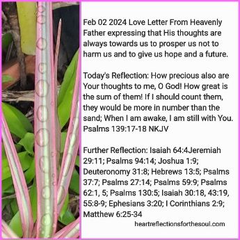 Today’s Reflection: How precious also are Your thoughts to me, O God! How great is the sum of them! If I should count them, they would be more in number than the sand; When I am awake, I am still with You. Psalms 139:17-18 NKJV