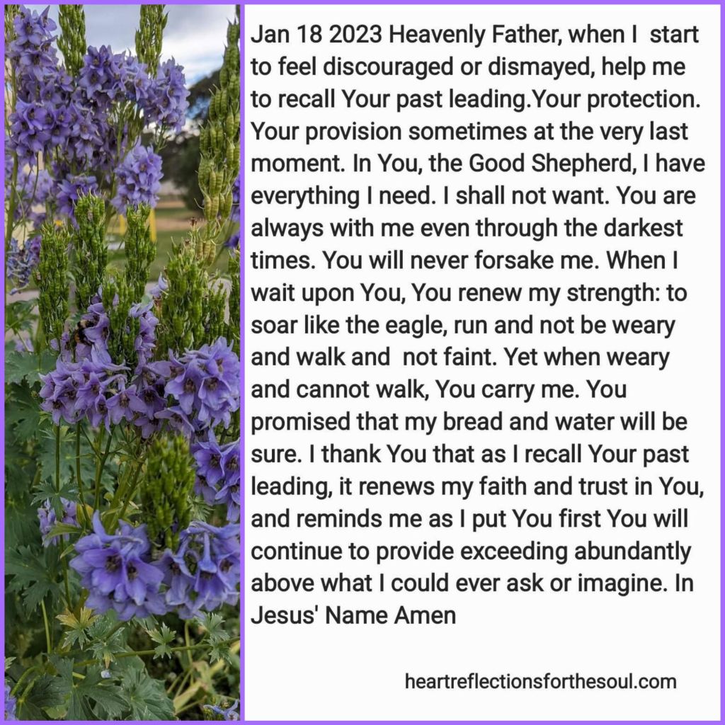 Heavenly Father, when I start to feel discouraged or dismayed, help me to recall Your past leading. Your protection. Your provision sometimes at the very last moment. In You, the Good Shepherd, I have everything I need. I shall not want. You are always with me even through the darkest times. You will never forsake me. When I wait upon You, You renew my strength: to soar like the eagle, run and not be weary and walk and not faint. Yet when weary and cannot walk, You carry me. You promised that my bread and water will be sure. I thank You that as I recall Your past leading, it renews my faith and trust in You, and reminds me as I put You first You will continue to provide exceeding abundantly above what I could ever ask or imagine. In Jesus’ Name Amen