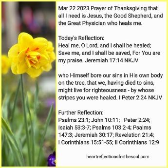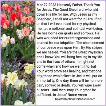 Heavenly Father, thank You for Jesus, The Good Shepherd, who laid down His life for me. With Jesus as my Shepherd, I shall not want for in Him I find aIl that I will ever need for my physical, mental, emotional, and spiritual well-being. He has borne our griefs and sorrows. He was wounded for our transgressions and bruised for our iniquities. The chastisement of our peace was upon Him. By His stripes, we are healed. You are the Great Physician, and I know You will bring healing in my life and in the lives of others. It might not come when and how we want it to, but Your Word promises healing, and that one day, those who believe in Jesus will put on immortality. One day, there will be no more pain, sorrow, or death. You will wipe away all tears. Until then, may Your grace be sufficient. In Jesus’ Name Amen