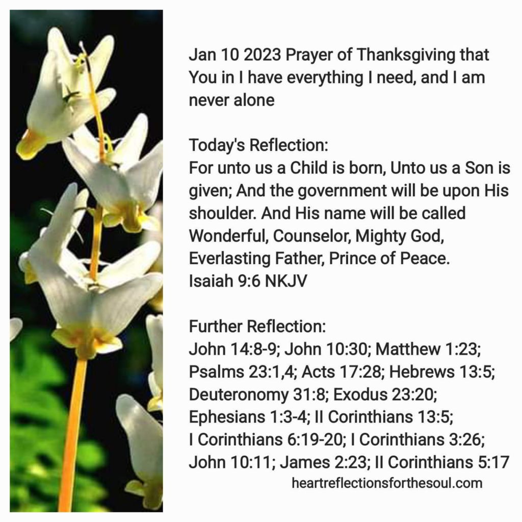 Heavenly Father, It is hard for finite humans to comprehend how You and Jesus are One. Jesus has said, “If you have seen me, you have seen the Father.” Your Word declares Jesus is Emmanuel, God with us, and prophecies that He would be called Wonderful, Counselor, The Everlasting Father, The Mighty God, The Prince of Peace. I thank You that in You I have everything I need. Without You, I would cease to exist. You have promised to never leave me or forsake me. In the Person of the Holy Spirit, You live within me. Even when I walk through the darkest valleys, I do not have to be afraid for You are with me. You are the Great Shepherd who laid down His life for me. My deepest desire is to know You, be like You and be Your forever friend. In Jesus’ Name Amen