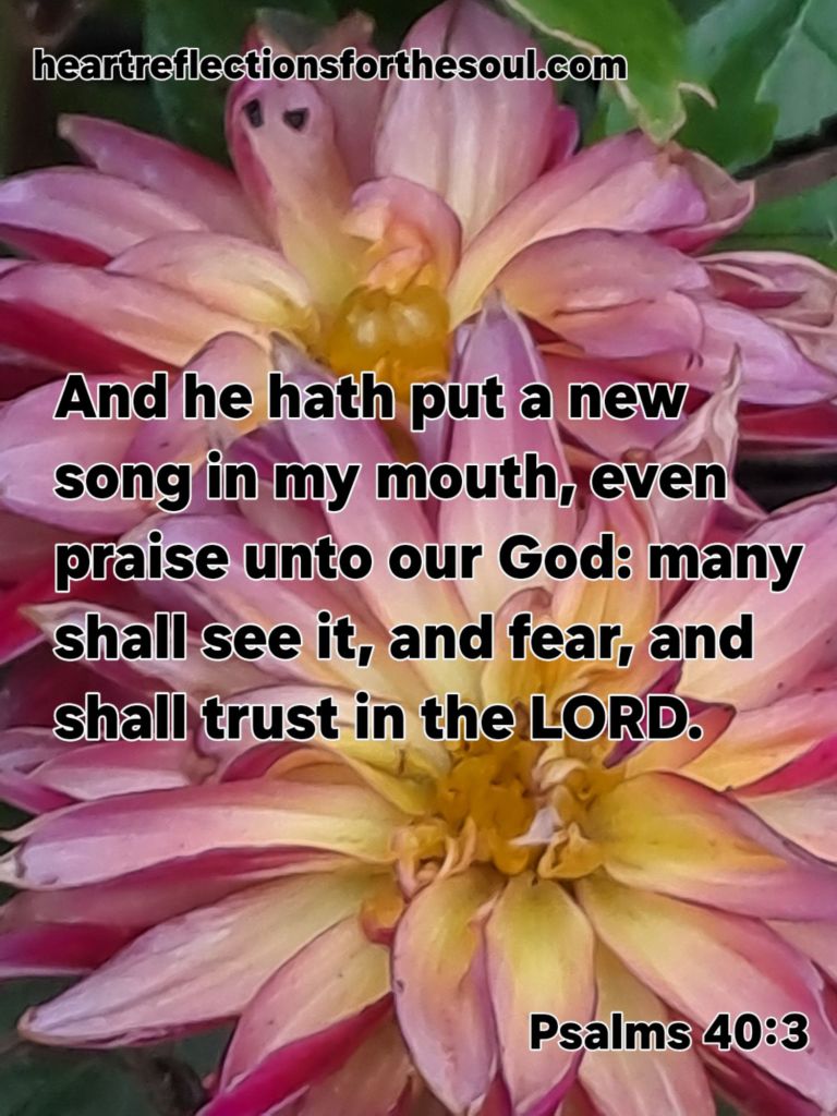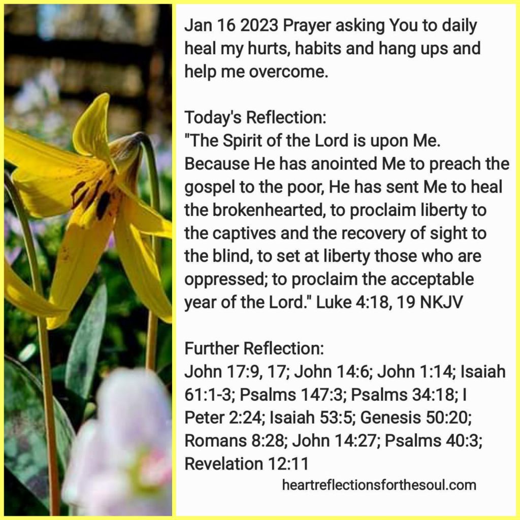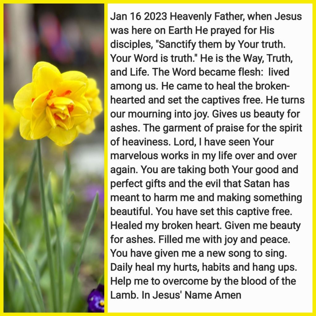 Heavenly Father, when Jesus was here on Earth He prayed for His disciples, “Sanctify them by Your truth. Your Word is truth.” He is the Way, Truth, and Life. The Word became flesh: lived among us. He came to heal the broken-hearted and set the captives free. He turns our mourning into joy. Gives us beauty for ashes. The garment of praise for the spirit of heaviness. Lord, I have seen Your marvelous works in my life over and over again. You are taking both Your good and perfect gifts and the evil that Satan has meant to harm me and making something beautiful. You have set this captive free. Healed my broken heart. Given me beauty for ashes. Filled me with joy and peace. You have given me a new song to sing. Daily heal my hurts, habits and hang ups. Help me to overcome by the blood of the Lamb. In Jesus’ Name Amen