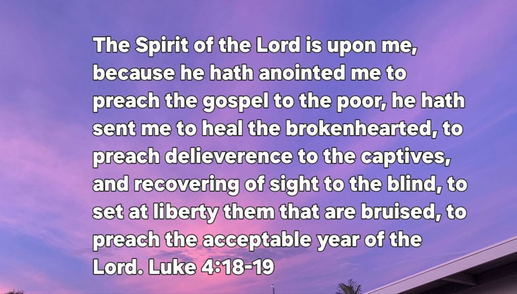“The Spirit of the Lord is upon Me. Because He has anointed Me to preach the gospel to the poor, He has sent Me to heal the brokenhearted, to proclaim liberty to the captives and the recovery of sight to the blind, to set at liberty those who are oppressed; to proclaim the acceptable year of the Lord.” Luke 4:18, 19 NKJV
