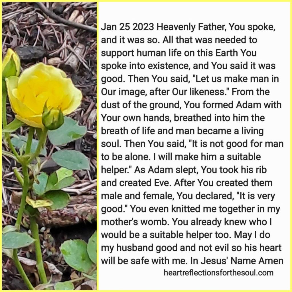 Heavenly Father, You spoke, and it was so. All that was needed to support human life on this Earth You spoke into existence, and You said it was good. Then You said, “Let us make man in Our image, after Our likeness.” From the dust of the ground, You formed Adam with Your own hands, breathed into him the breath of life and man became a living soul. Then You said, “It is not good for man to be alone. I will make him a suitable helper.” As Adam slept, You took his rib and created Eve. After You created them male and female, You declared, “It is very good.” You even knitted me together in my mother’s womb. You already knew who I would be a suitable helper too. May I do my husband good and not evil so his heart will be safe with me. In Jesus’ Name Amen